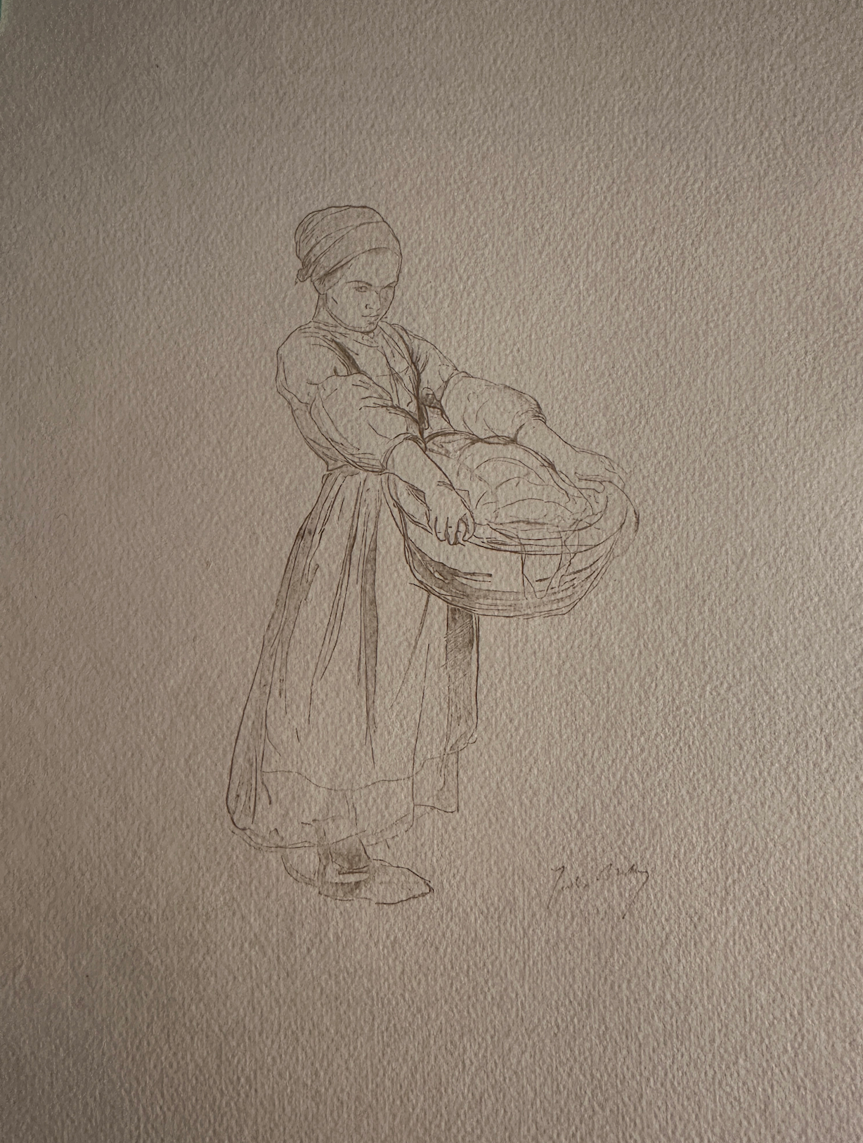 Vers 1865-70 [Signé en bas à gauche : Jules Breton] Sanguine et craie blanche 52 x 29,7 cm (20 1/2 x 11 3/4 in.) Localisation actuelle inconnue Provenance Nicolas Auguste Laurens. Albert Finot jusqu’en 1941 (cachet en bas à droite : L.3627) ; par descendance, André Finot, probablement jusqu’en 1980. [vente, 19 mars 1982, lot 24].[Paris, Galerie La Scala].