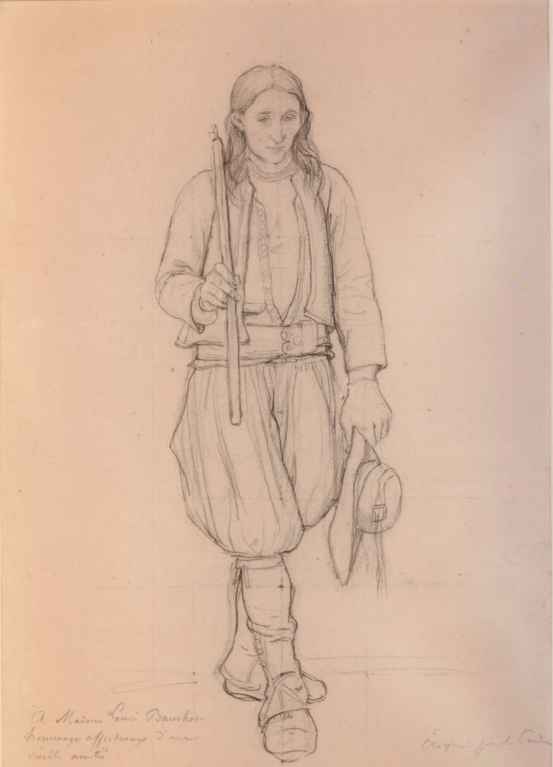 1868 [Daté en bas au centre 68] Mine de plomb sur papier gris 47 x 30 cm (18 1/2 x 12 in.) France, collection particulière Sujet Figure de gauche, ici en buste, des trois bretons ouvrant le cortège de Un grand Pardon breton Provenance Atelier de l’artiste ; France, collection particulière Expositions Arras, 1976-1977
