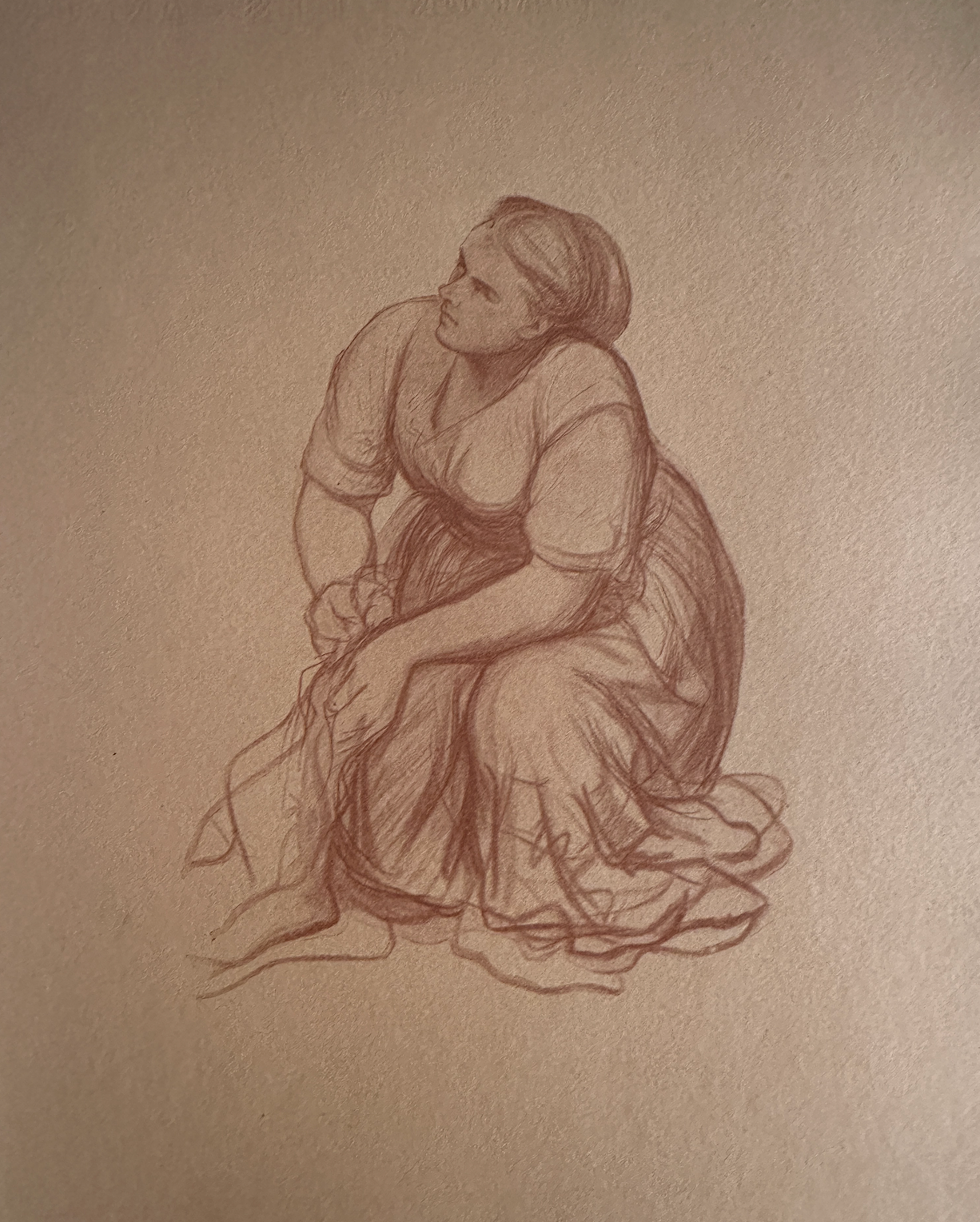 1870 [Signé en bas à droite : Jules Breton ; Monogramme au centre droit : RM [?] et cachet en bas à gauche : Michallet] Fusain sur papier gris, mis au carreau 43,3 x 58,3 cm (17 1/8 x 22 7/8 in.) Localisation actuelle inconnue Provenance Paris, comtesse de Balleroy. [Shepherd Gallery, New York, 1976] Expositions 1976, New York, n°30